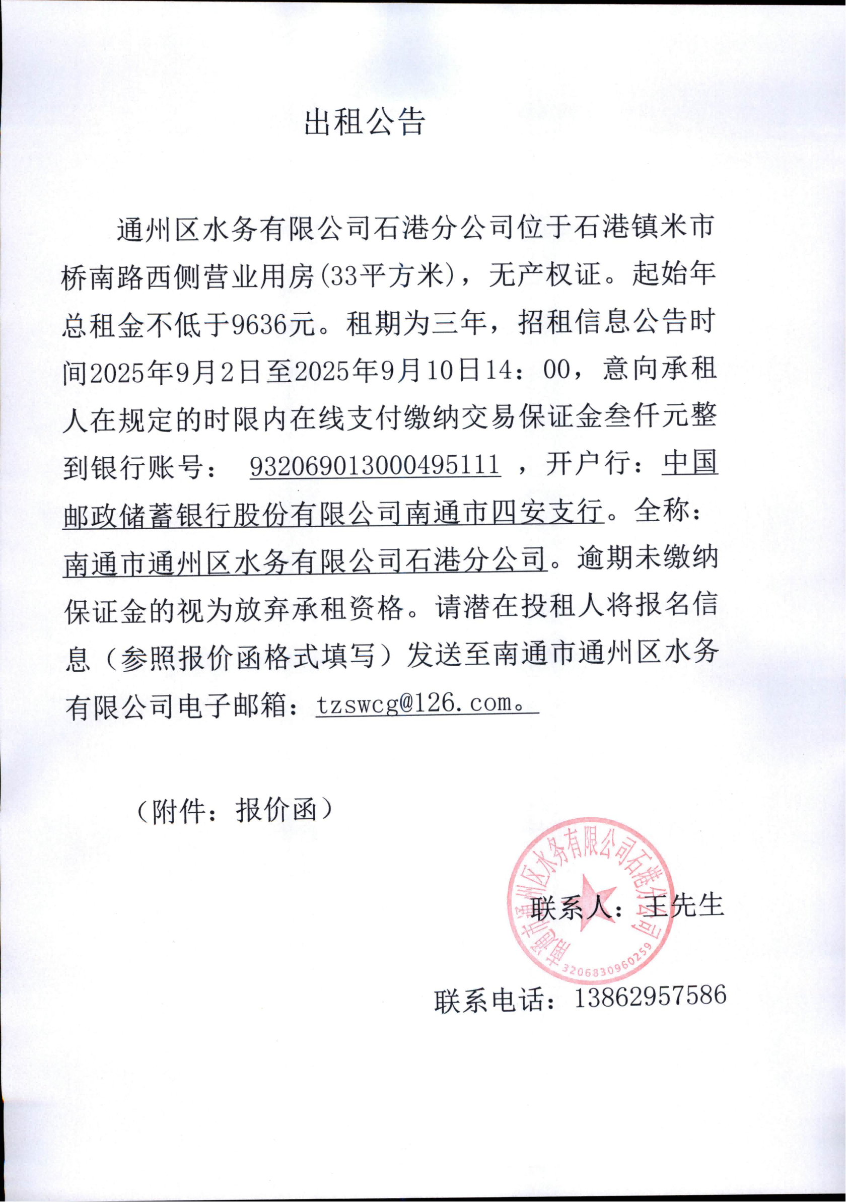 • 南通市通州區水務有限公司石港分公司米市橋南路西側營業用房(33平方米)出租公告2025-09-01
